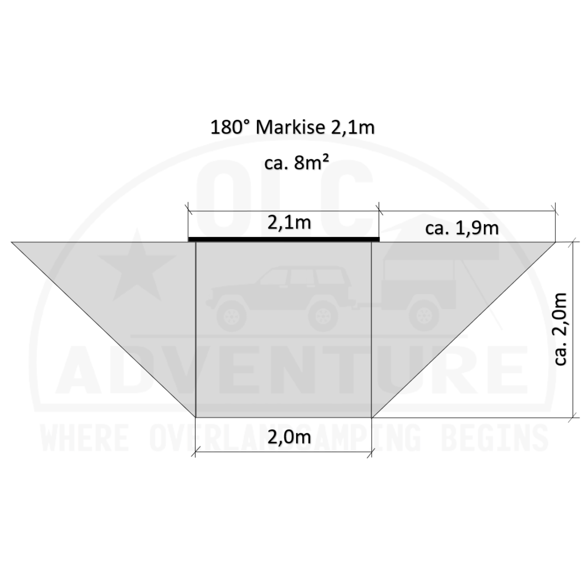 Unsere 180° Markise verfügt in der 2,1 m Variante seitlich am Fahrzeug gute 8 m² Schatten und Wetterschutz.