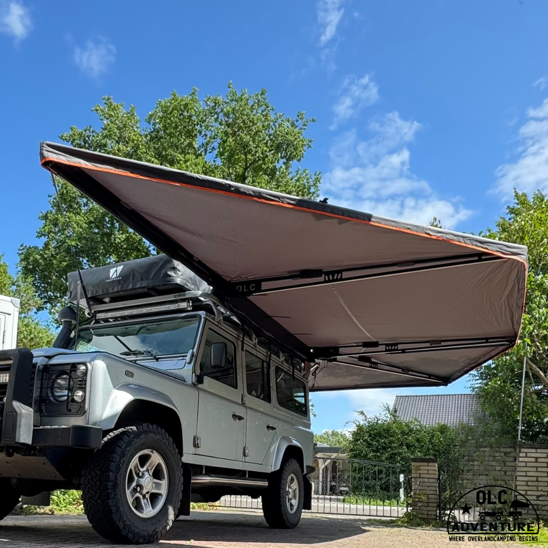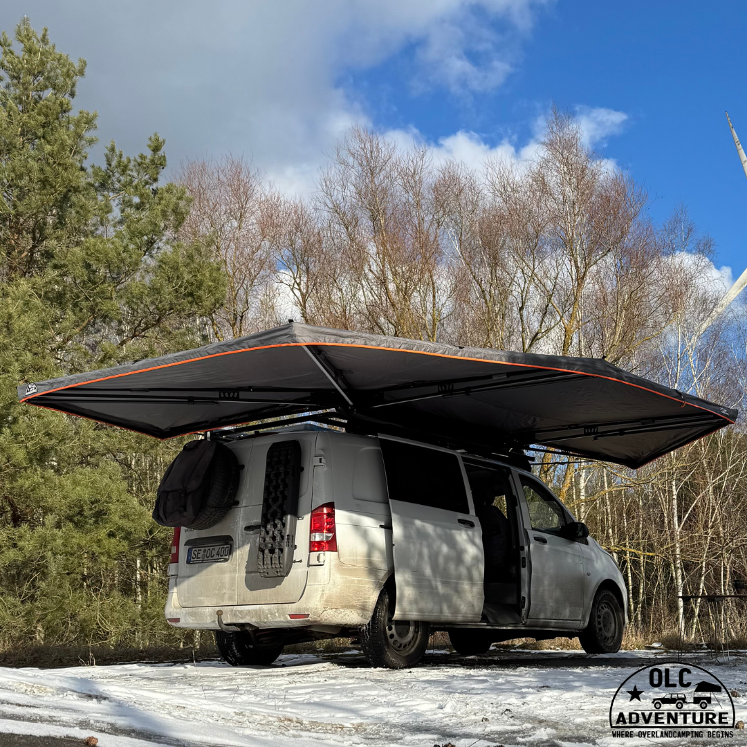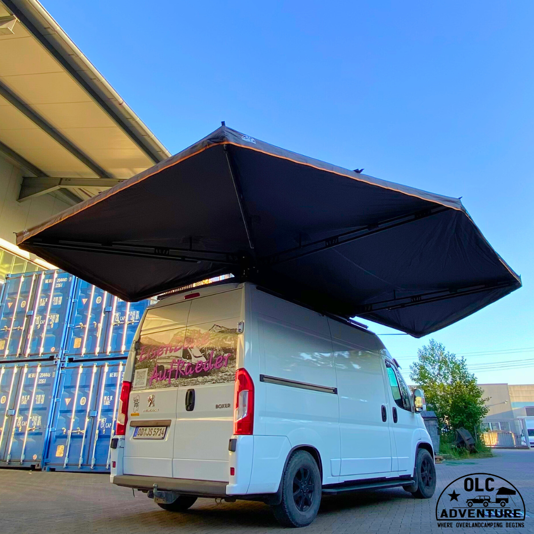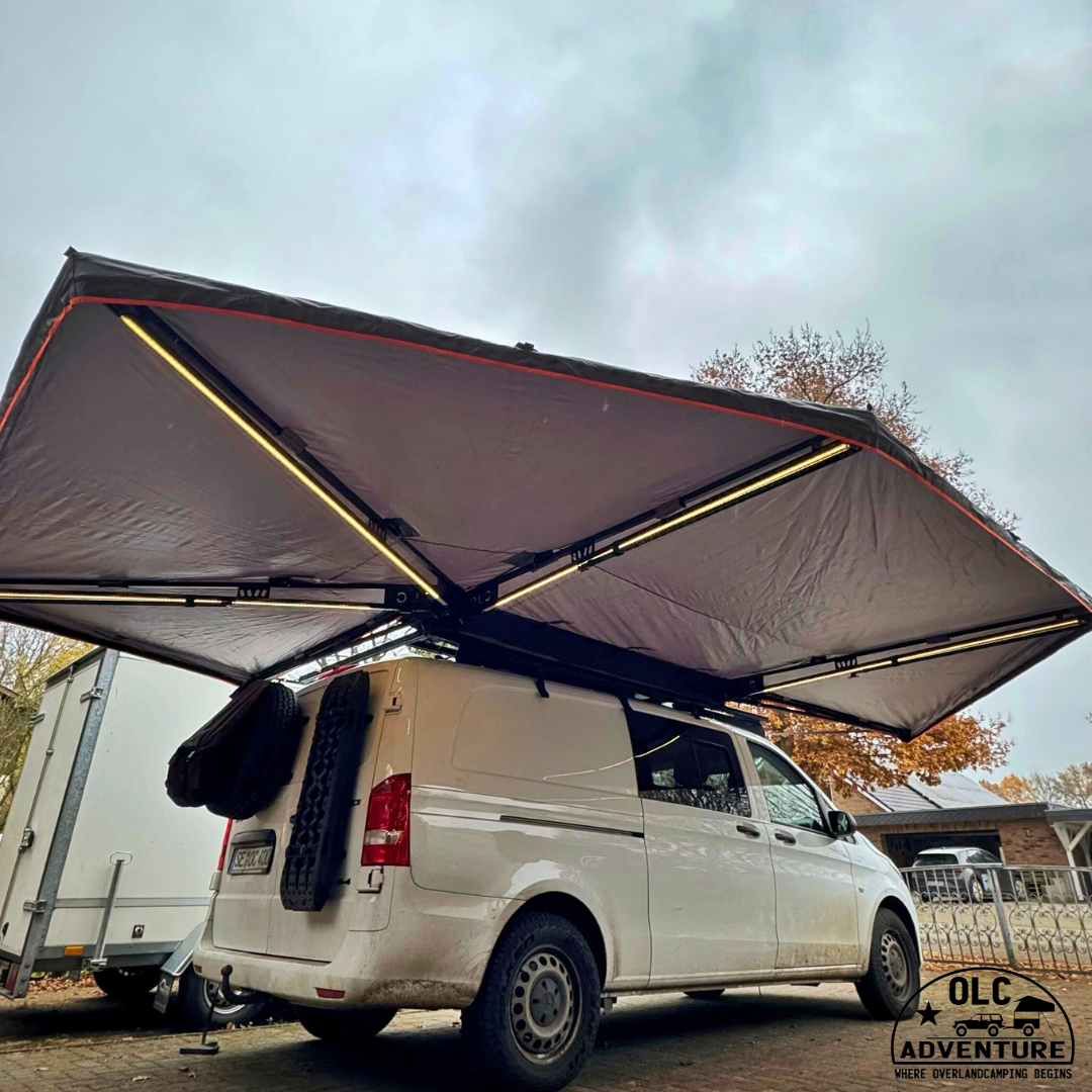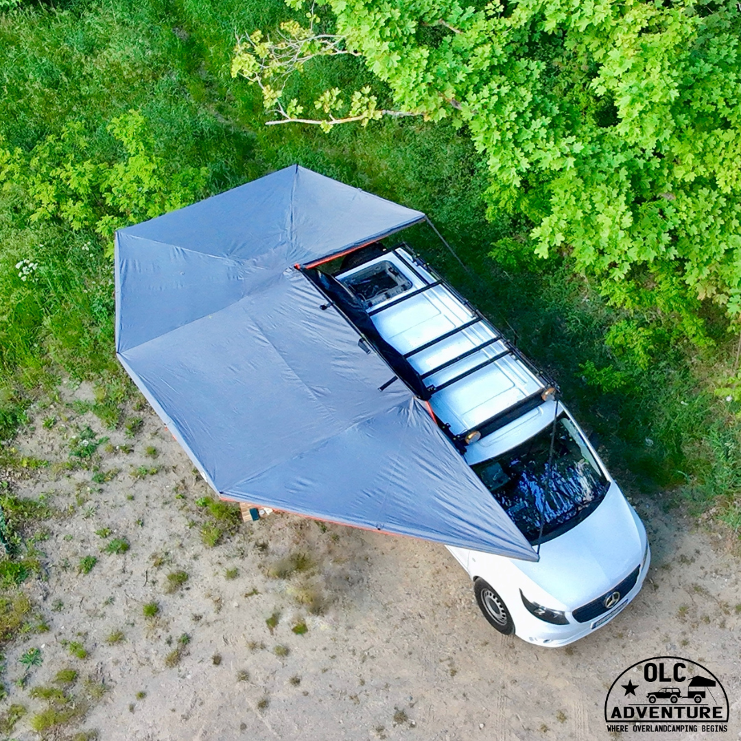 Die freitragende 270° Markise in der großen Xtended Variante von OLC Adventure ist innerhalb weniger Minuten komplett aufgebaut. Passend für viele Vans, Busse und andere größere Fahrzeuge wie dem 110er Defender u.ä. Sie zeichnet sich durch eine durchdachte, leichte und trotzdem sehr stabile Konstruktion aus. Jeder Arm der Markise hat seinen eigenen Drehpunkt und ist durch die verschweißte, doppelte 4 Kant-Aluminiumrohr Konstruktion im A-Design enorm belastbar. Kleine Aufsteller auf den Armen geben dem Stoff ein Gefälle, damit Regenwasser gut und gezielt ablaufen kann. Die 3 integrierten Teleskopstützen helfen bei leicht windigem Wetter die Markise am Boden zu befestigen. Sollte es etwas mehr auffrischen, können die 3 übrigen Teleskopstangen im Handumdrehen installiert werden. 6 signalfarbene Abspannbänder und Heringe geben der Markise dabei guten Halt. Zwischen den Armen lässt sich die Markise nochmals abspannen, damit das Regenwasser auch sicher seinen Ablauf hat. Der Stoff besteht aus einem 600D Polyesterstoff, welcher leicht und trotzdem sehr belastbar ist. Er verfügt über einen UV-50 Sonnenschutz, ist tauchimprägniert und von unten PU beschichtet.