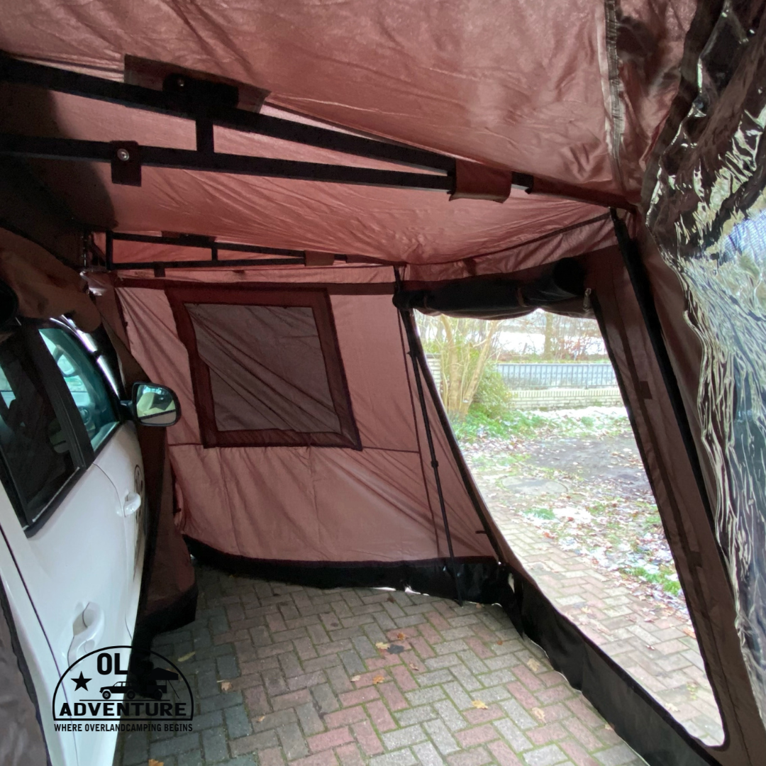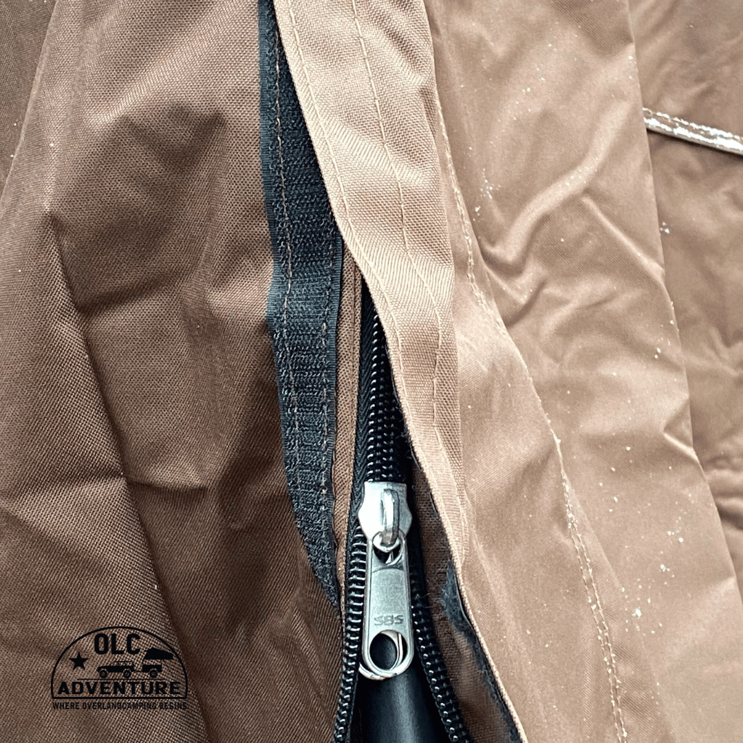 Die 3 Fahrzeugseitigen Seitenwände verfügen bei der mittleren Seitenwand über einen Reißverschluss mit großzügiger Öffnung, um an das Fahrzeug zu gelangen.