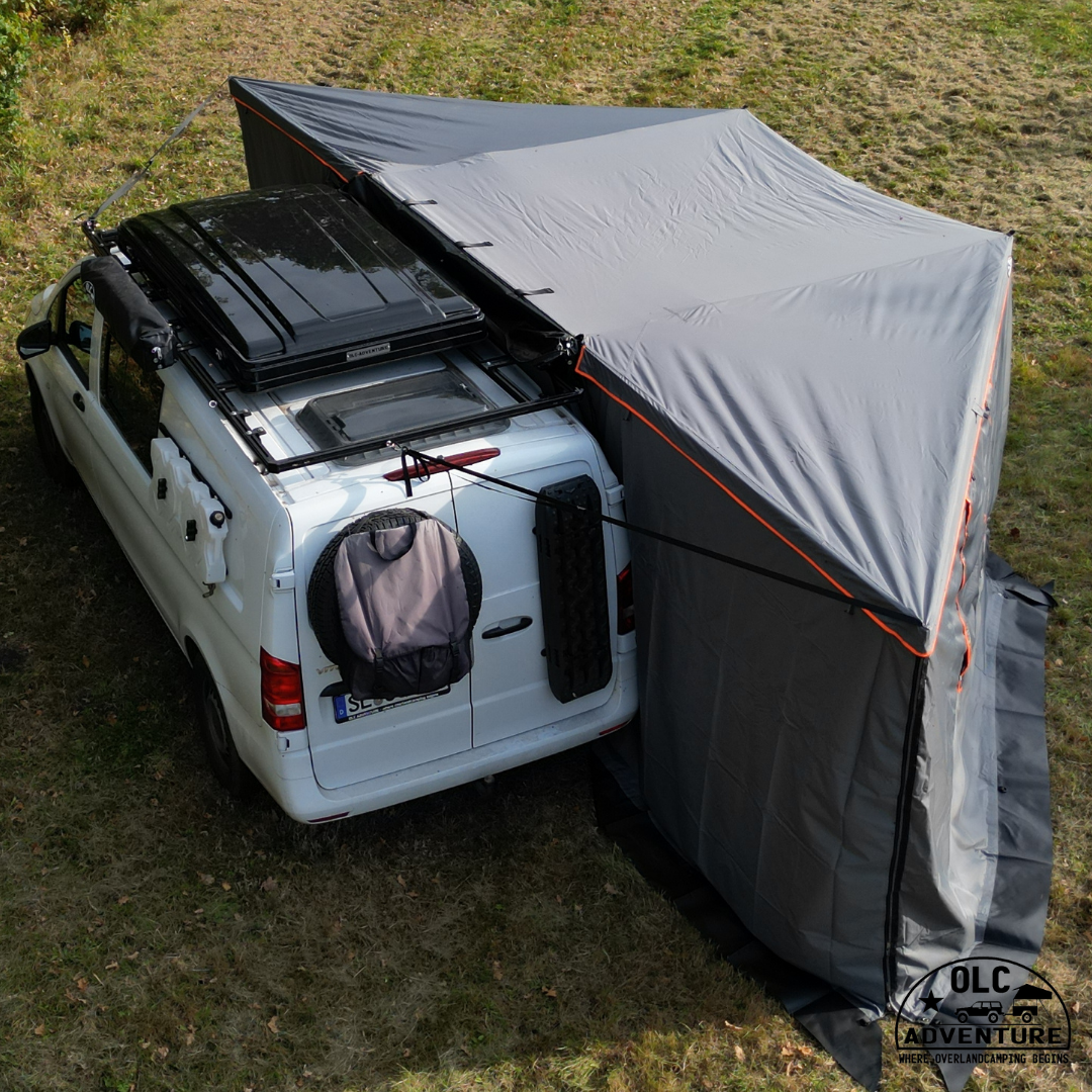 Die 3 Fahrzeugseitigen Seitenwände verfügen bei der mittleren Seitenwand über einen Reißverschluss mit großzügiger Öffnung, um an das Fahrzeug zu gelangen.