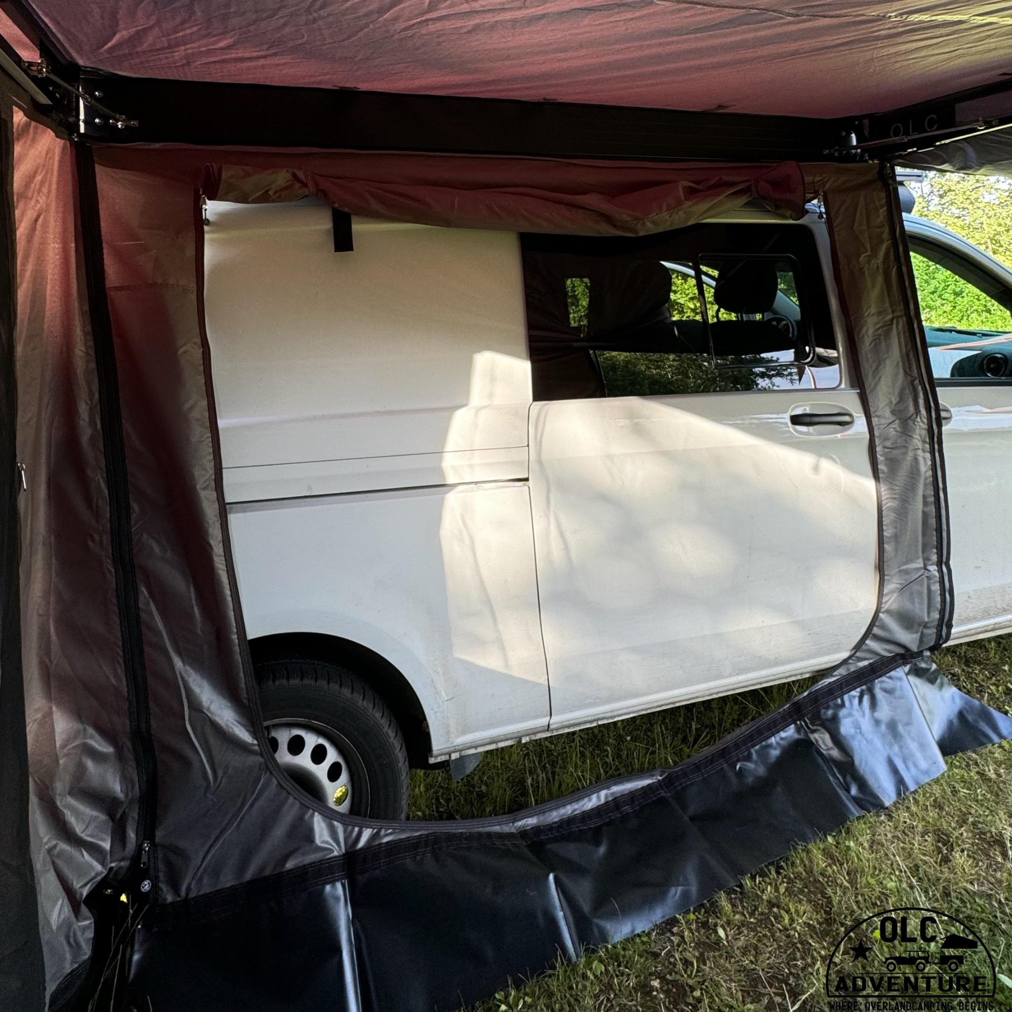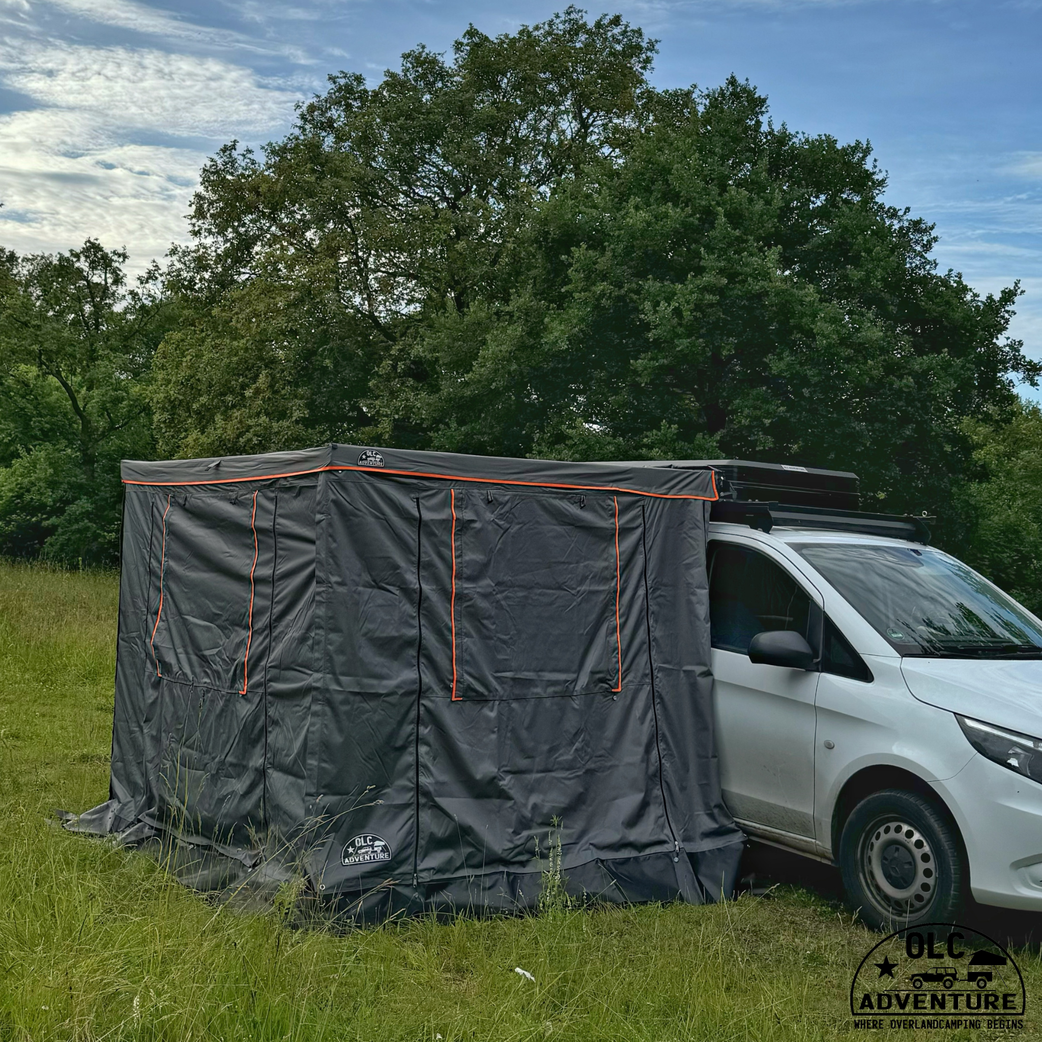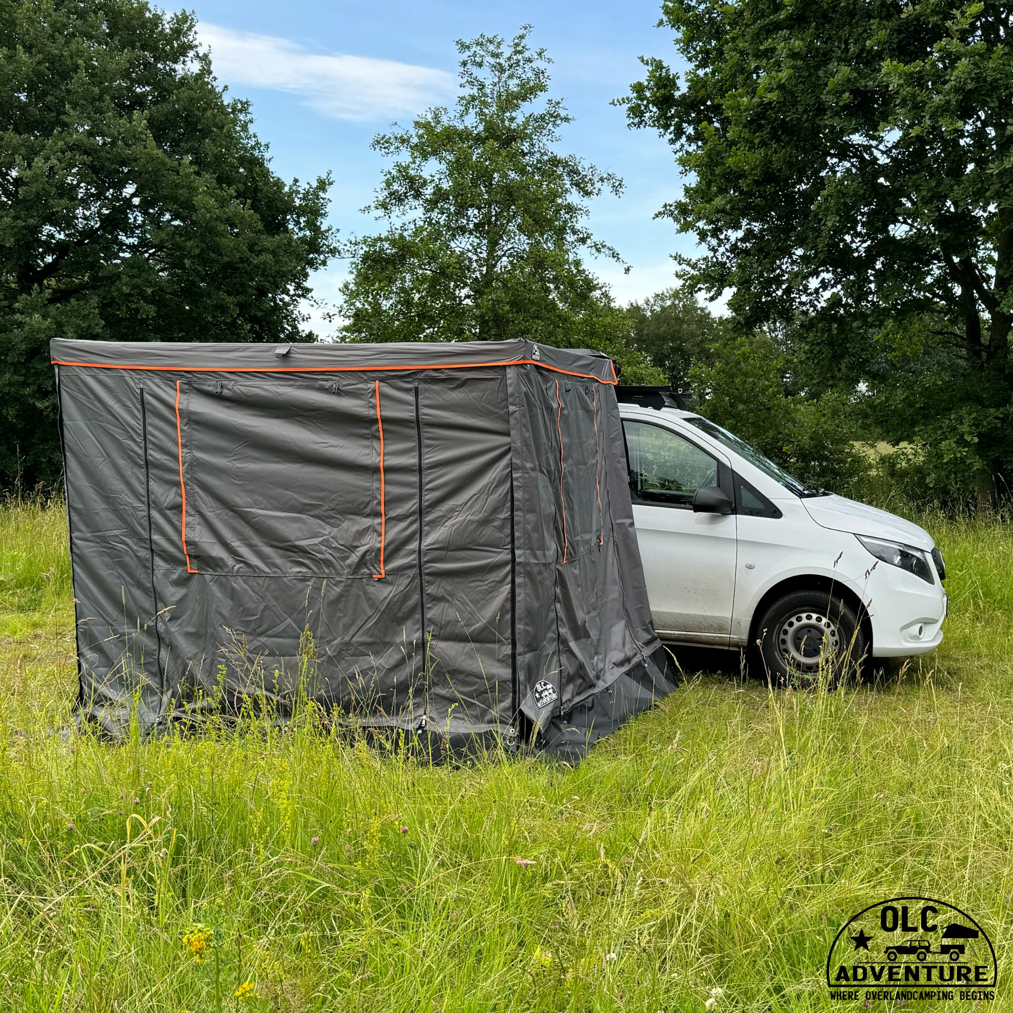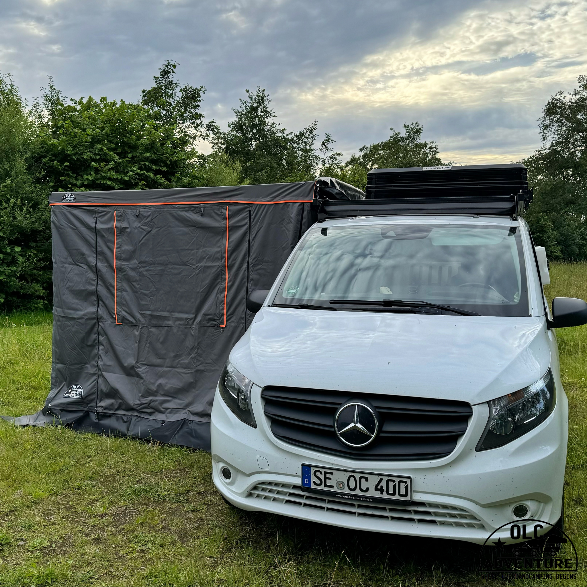 Die Fahrzeugseitige Seitenwand verfügt über einen Reißverschluss mit großzügiger Öffnung, um an das Fahrzeug zu gelangen.